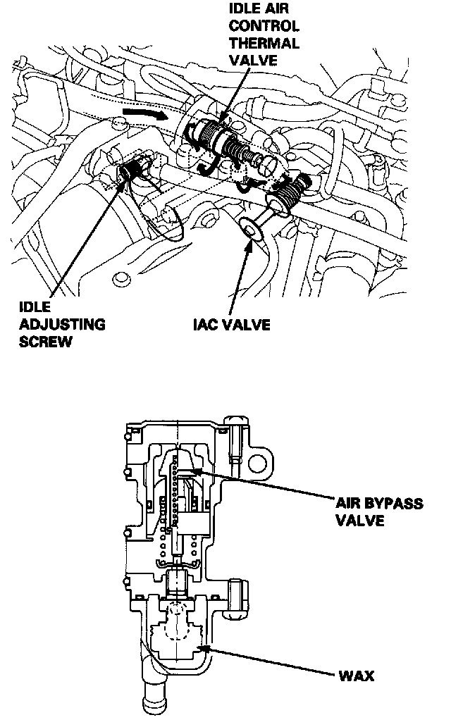 To prevent erratic running when the engine is warming up, it is necessary to raise the idle speed. The idle air control thermal valve is controlled by a thermowax plunger. When the engine is cold, the engine coolant surrounding the thermowax contracts the plunger, allowing additional air to be bypassed into the intake manifold so that the engine idles faster. When the engine reaches operating temperature, the valve closes, reducing the amount of air bypassing into the intake manifold.
