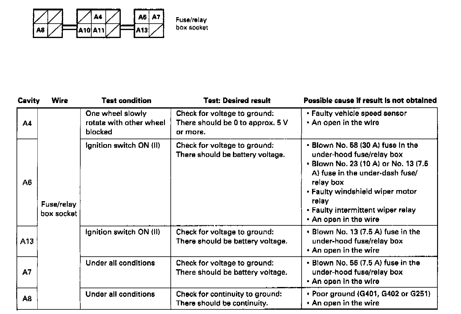 * If the terminals look OK, make the following input tests at the connector and the fuse/relay box socket.