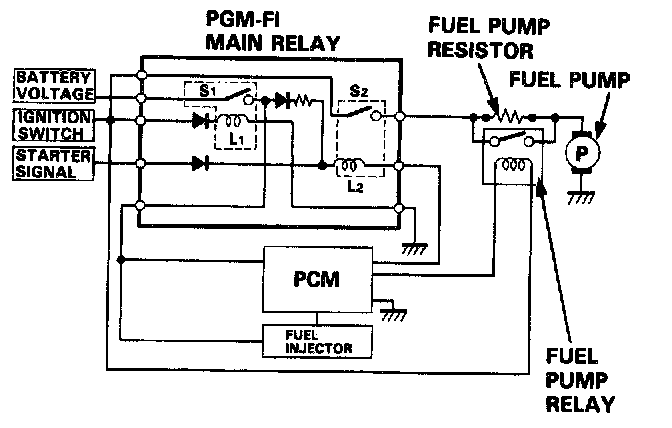 This PGM-FI main relay is located behind the dashboard lower cover. The PGM-FI main relay actually contains two individual relays. One relay is energized whenever the ignition is on. It supplies battery voltage to the PCM, power to the fuel injectors, and power for the second relay. The second relay is energized for two seconds when the ignition is switched on, and when the engine is running. It supplies power to the fuel pump.