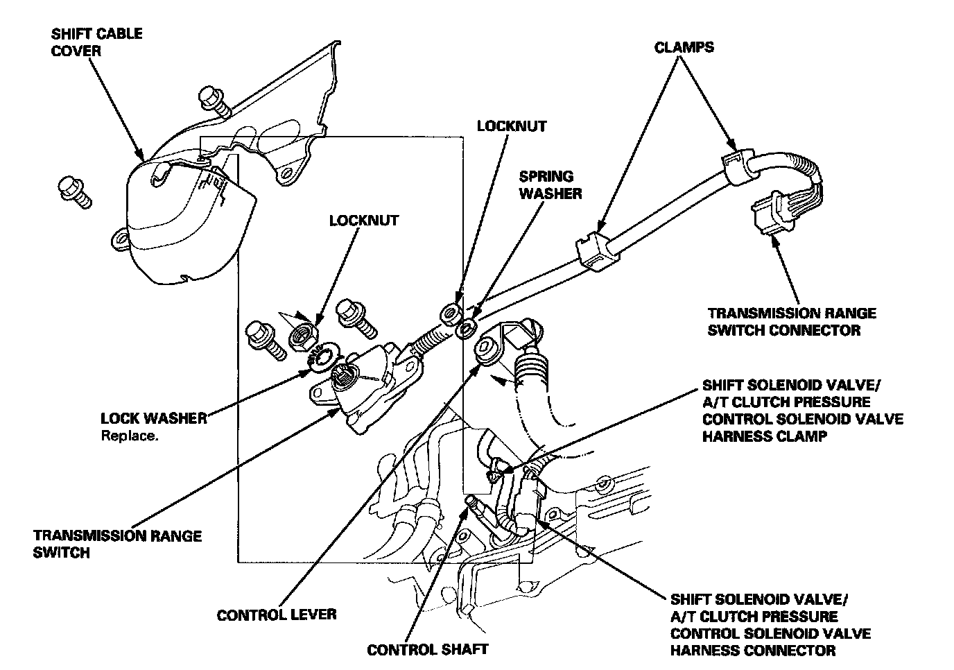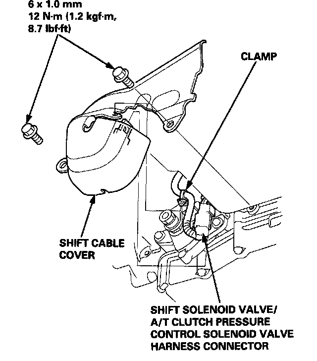 20. Install the shift solenoid valve/A/T clutch pressure control solenoid valve harness clamp to the shift cable cover, then install the shift cable cover onto the transmission.