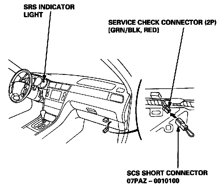 Special Tools Required: SCS Service Connector 07PAZ - 00101001. Turn the ignition switch OFF, and wait for ten seconds. Then connect the SCS short connector to the service check connector (2P). If you don't wait ten seconds, the SRS unit won't be completely reset or output DTCs.