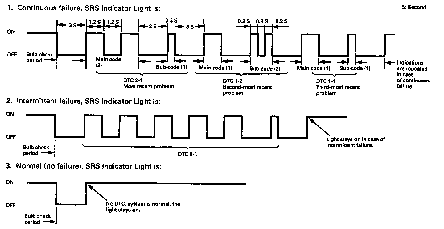 - In case of an intermittent failure, the SRS indicator light will indicate the DTC one time, then it will stay on (see example 2 in fig).