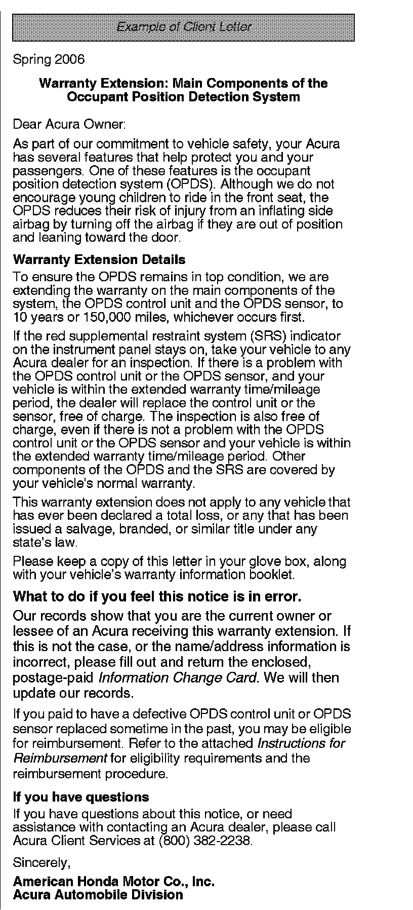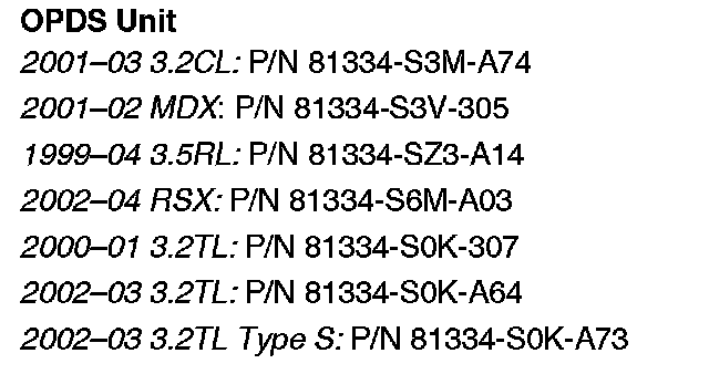 Because of a class action settlement, the warranty extension coverage for the OPDS unit and the OPDS sensor on 2002-03 3.2CLs, 2002 MDXs, 2002-04 3.5RLs, 2002-04 RSXs, and 2002-03 3.2TLs purchased or leased between April 13, 2002, and November 7, 2006, is now 10 years or 157,500 miles, whichever occurs first. For more information, refer to Service Bulletin 06-050, Warranty Extension: Vehicle Warranty Mileage.