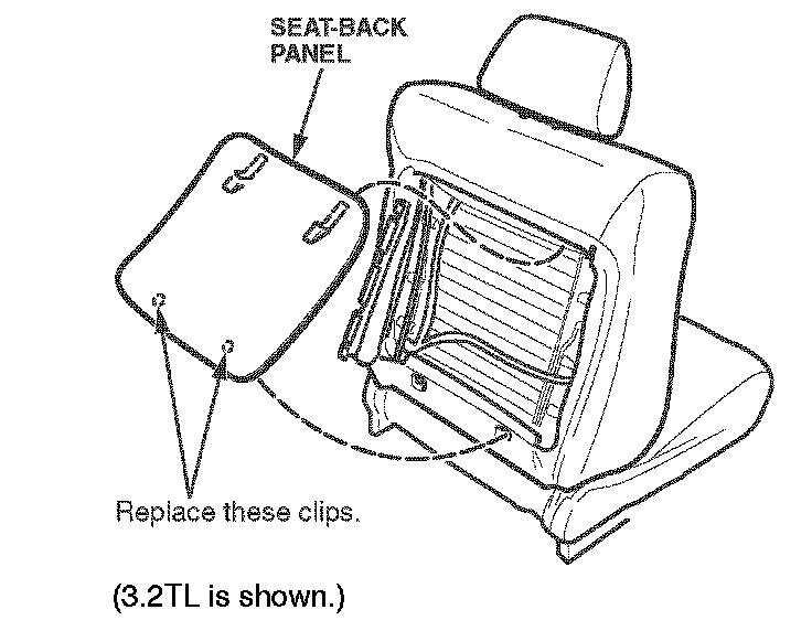 1. On all models except RSXs, remove the front passenger's seat-back panel by prying out the bottom. Replace the seat-back panel lower clips.