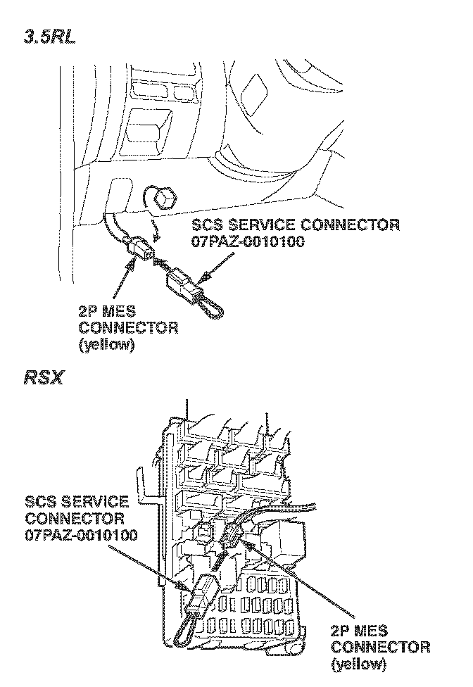 4. On 3.5RLs, connect the SCS service connector to the 2P service check connector. Do not use a jumper wire. Refer to page 24-88 of the 1996-01 3.5HL Service Manual for details. Go to step 8.