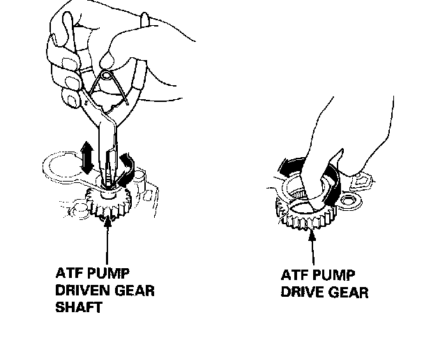 6. Tighten the bolts on the ATF pump body to the specified torque. Make sure the ATF drive gear and the ATF driven gear shaft move smoothly.