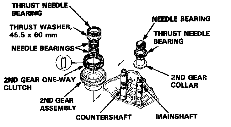 22. Install the countershaft 2nd gear assembly, 2nd gear one-way clutch, needle bearings, thrust washer, and thrust needle bearing on the countershaft.