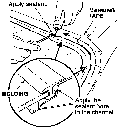 3. With an 0-ring pick or similar tool, pull up the outer edge of the molding and apply 3M Black Super Silicone Sealant under it, along the A-pillars and the upper edge of the windshield.