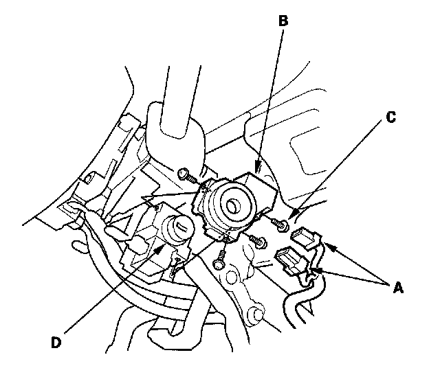 4. Remove the screws (C) and the immobilizer receiver unit from the ignition key cylinder (D).