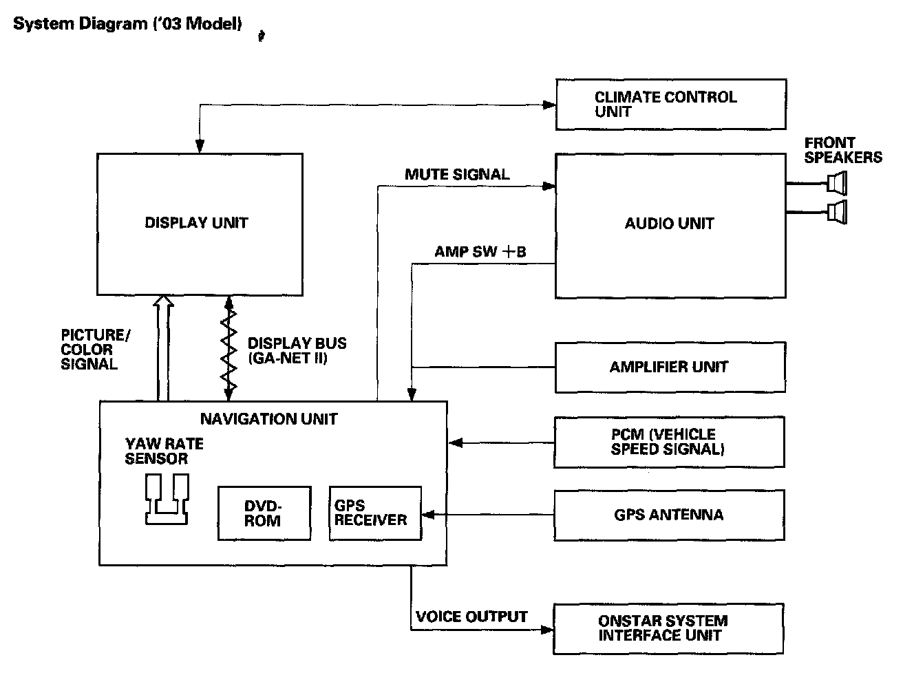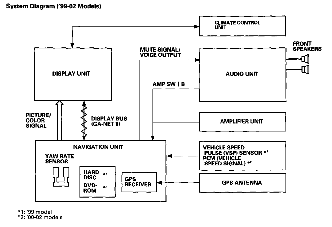 The navigation unit calculates the vehicle position and guides you to the destination. The unit performs map matching correction, GPS correction, and distance tuning. It also controls the menu functions and the DVD-ROM drive ('00-01 models) or hard disk drive ('99 model). With control of all these items, the navigation unit makes the navigation picture signal, then it transmits the signal to the display unit and audio driving instructions to the audio unit.