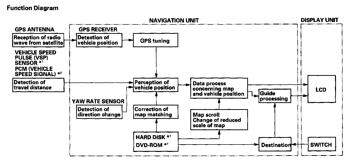 The navigation system receives signals from the Global Positioning System (GPS), a network of 24 satellites in orbit around the earth. By receiving signals from several of these satellites, the Navigation System can determine the latitude and longitude of the vehicle. In addition, signals from the system's yaw rate sensor, the vehicle speed pulse (VSP) sensor *(1) or PCM (vehicle speed signal) *(2) enable the system to keep track of the vehicle's direction and speed of travel.