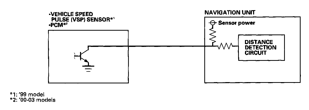The vehicle speed pulse signal is outputted by the vehicle speed pulse (VSP) sensor *(1) or PCM *(2). The VSP sensor is driven by the differential gear. For every revolution of the sensor, a four-pulse signal is sent to the navigation unit. The PCM receives the signal which is outputted by the counter shaft speed sensor, then the PCM process the signal and transmit the signal to the speedometer and other system.