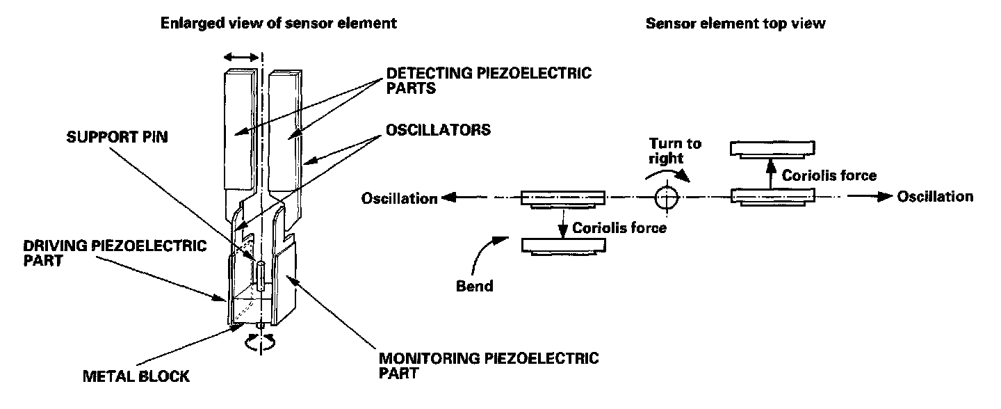 The sensor element is shaped like a tuning fork, and it consists of the piezoelectric parts, the metal block, and the support pin. There are four piezoelectric parts: one to drive the oscillators, one to monitor and maintain the oscillation at a regular frequency, and two to detect angular velocity. The two oscillators have a 90 degree twist in the center, are connected at the bottom by the metal block, and supported by the support pin. A detection piezoelectric part is attached to the top of each oscillator. The driving piezoelectric part is attached to the bottom of one oscillator, and the monitoring piezoelectric part is attached to the bottom of the other oscillator.