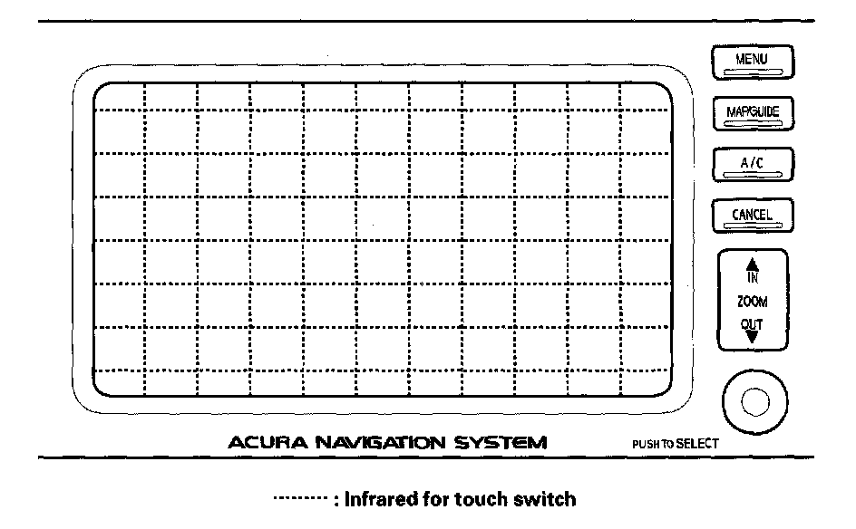 The display unit uses liquid crystal display (LCD). The LCD is a 6-inch-wide, thin film transistor (TFT), stripe type with 280,800 picture elements. The color film and fluorescent light are laid out on the back of the liquid crystal film. The touch sensor on the front of the LCD is an infra red type with 10 vertical and 7 horizontal infrared rays to produce 70 sensing points. The display unit transmits the signal from each operation key and the touch switches to the navigation unit.