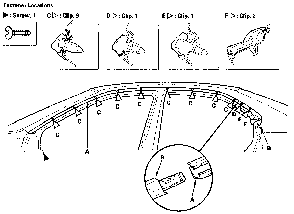 1. Remove the screw from the front edge of the roof drip molding. Detach the moldings from each clip, then remove the roof drip molding (A) and rear pillar molding (B) as an assembly. Take care not to scratch the body.
