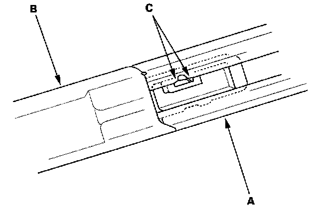 - After joining the rear pillar molding (B) with the roof drip molding (A), lightly tap the locking tabs (C).