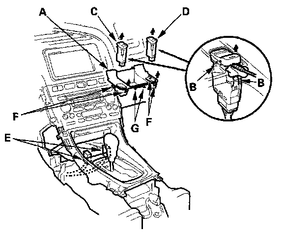 1. Carefully insert a flat-tip screwdriver next to the clip (B), and detach the clips by prying on the driver's seat heater switch (C) and passenger's seat heater switch (D). Take care not to scratch the console panel tray.