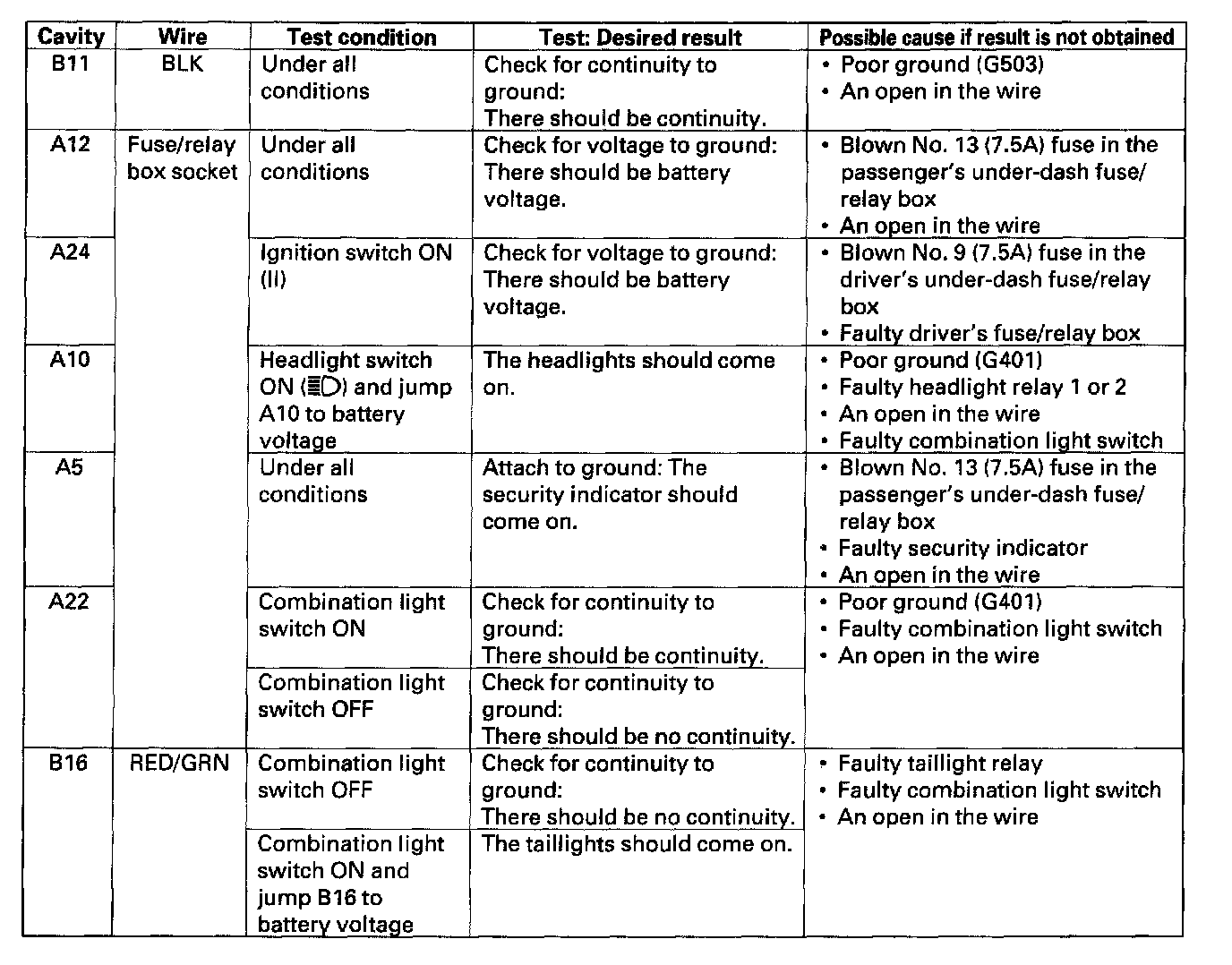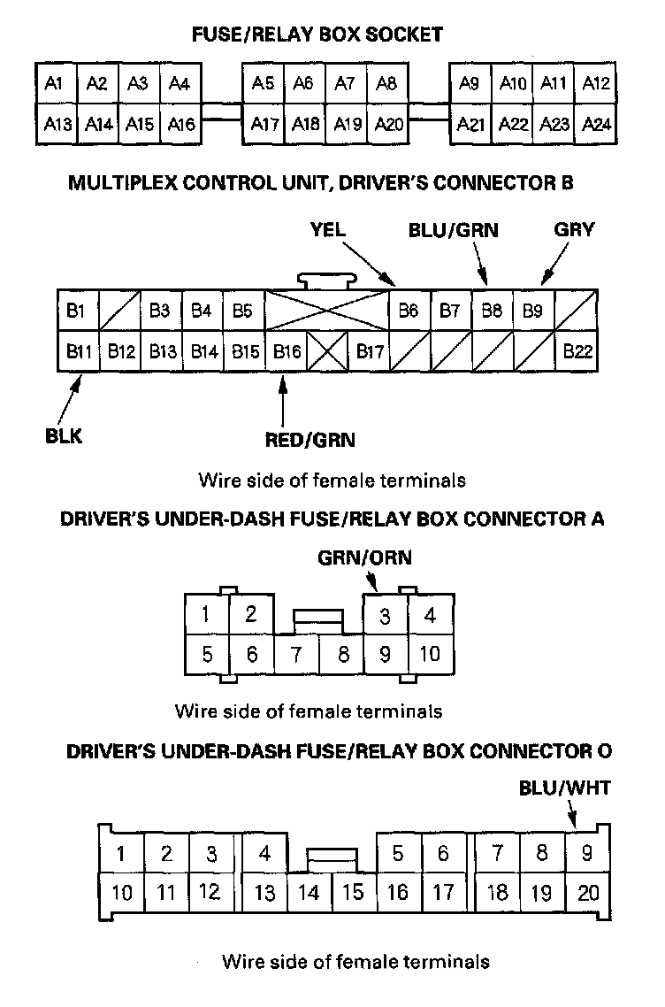 4. With the driver's [1][2]multiplex control unit still disconnected, make these input tests at the connector and driver's under-dash fuse/relay box sockets.