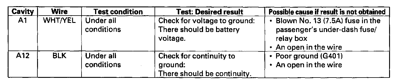 8. With the passenger's [1][2]multiplex control unit still disconnected, make these input tests at the connectors and the passenger's under-dash fuse/relay box sockets.