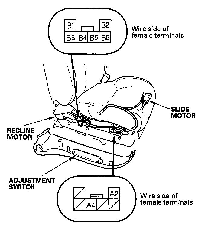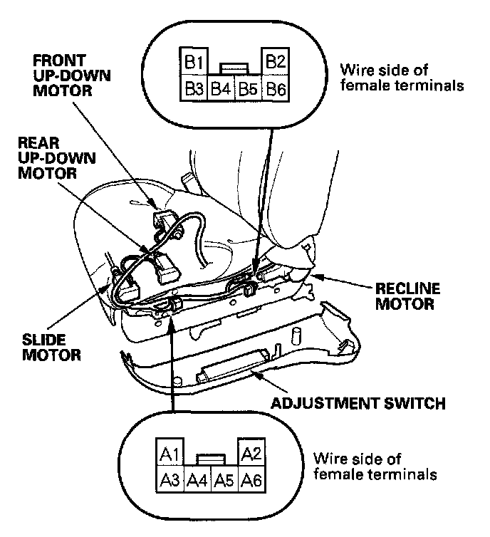 4. If the motor does not run or fails to run smoothly, check for an open in the power seat wire harness between the 6P connector and the 2P or 4P connectors. If the harness is OK, replace the motor '99 model, '00 model, '01 model.