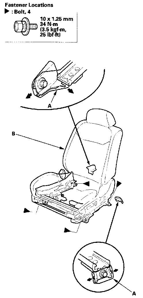 2. Remove the seat track end covers (A), and remove the bolts securing the front seat (B). When prying with a flat-tip screwdriver, wrap it with protective tape to prevent damage. Take care not to scratch the body or tear the seat covers.
