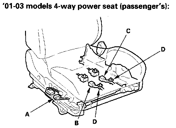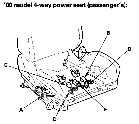 3. Lift up the front seat, then disconnect the seat harness connector (A). On '00-01 models, disconnect the side airbag connector (B). And on the '00-01 models passenger's seat only, disconnect the OPDS unit connector (C), and detach the harness clips (D) and connector clip (E).