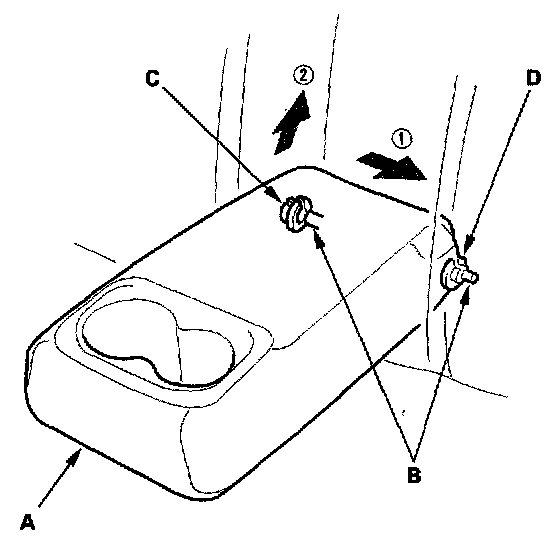 2. Remove the pivot shaft (B) from the collar (C) on the passenger's side of the vehicle by pulling up on the armrest, and remove the pivot shaft (B) from the collar (D) by pulling up on the armrest.
