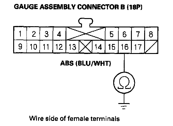9. Check for continuity between the gauge assembly connector B (18P) terminal No. 16 and body ground.