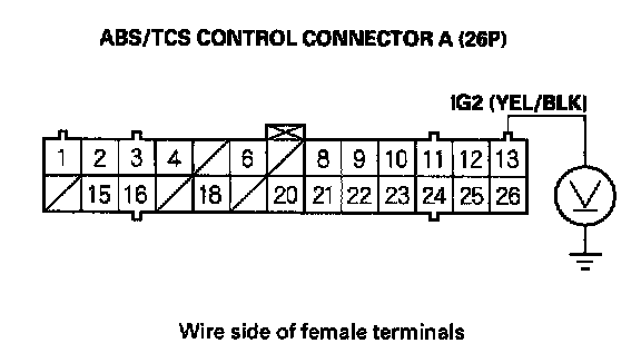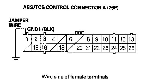 14. Connect the ABS/TCS control unit connector A (26P) terminal No. 1 to body ground with a jumper wire.