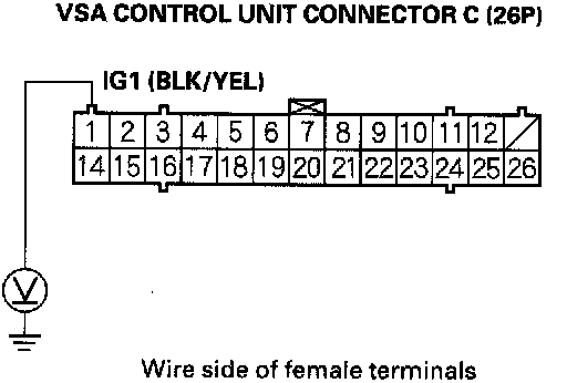 4. Measure the voltage between VSA control unit connector C (26P) terminal No. 1 and body ground.