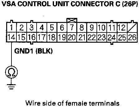 6. Check for continuity between VSA control unit connector C (26P) terminal No. 14 and body ground.