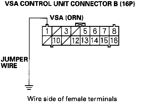 8. Connect VSA control unit connector B (16P) terminal No. 1 and body ground with a jumper wire.