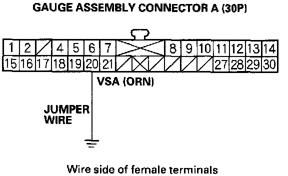 9. Connect gauge assembly connector A (30P) terminal No. 20 and body ground with a jumper wire.