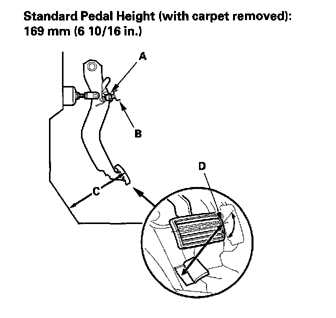 2. Pull back the carpet. At the insulator cutout, measure the pedal height (c) from the middle of the right side of the pedal pad (D).