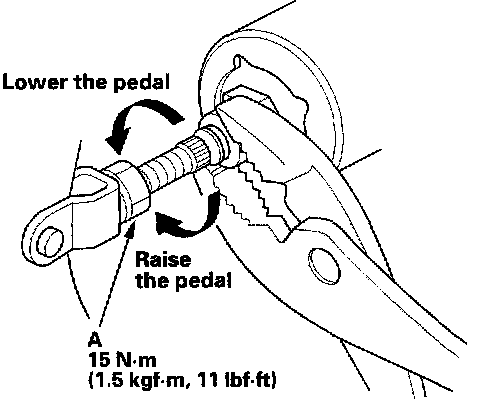 3. Loosen the pushrod locknut (A), and screw the pushrod in or out with pliers until the standard pedal height from the floor is reached. After adjustment, tighten the locknut firmly. Do not adjust the pedal height with the pushrod pushed in.