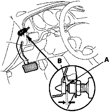 1. Disconnect the brake pedal position switch (brake switch) connector, loosen the brake pedal position switch locknut (A), and back off the brake pedal position switch (B) until it is no longer touching the brake pedal.