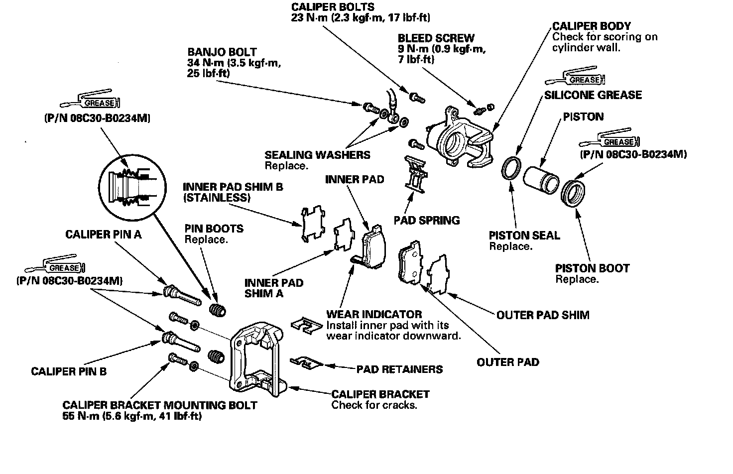 Rear Brake Caliper OverhaulRemove, disassemble, inspect, reassemble, and install the caliper, and note these items: