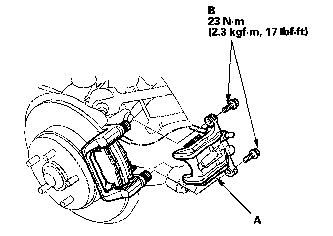 14. Install and torque the caliper bolts (B) to proper specification.