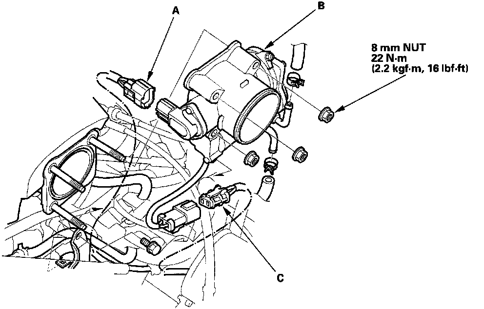 3. Disconnect the TCS control valve sensor 3P connector (A) and TCS control valve actuator 2P connector (C), then remove the TCS control valve assembly.