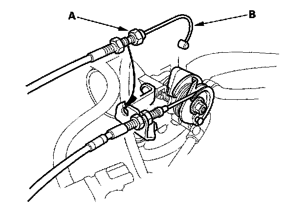 1. Loosen the locknut (A), then disconnect the actuator cable (B) from the throttle linkage.