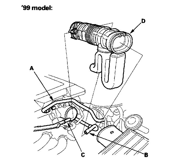 8. Remove the vacuum hose (B) and breather pipe (C), then remove the intake air duct (D).