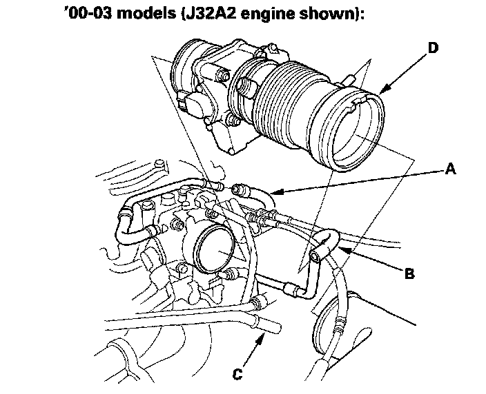 6. Remove the water bypass hoses (A). Disconnect the TCS control valve actuator connector (B) and the TCS control valve angle sensor connector (C) from the TCS control valve assembly, then remove the bolt (D) securing the TCS control valve bracket (J32A2 engine).