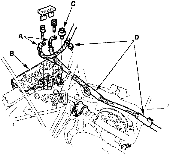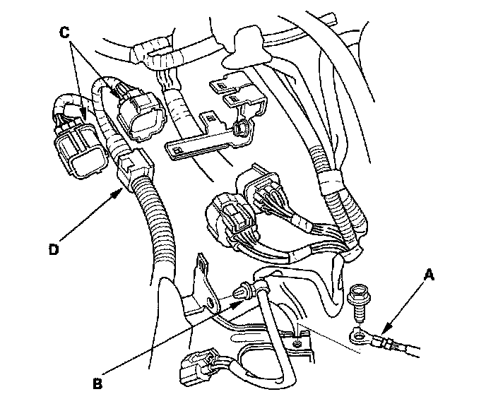 15. Disconnect the engine wire harness connectors (C), and remove the harness clamp (D) on the left side of the engine compartment.