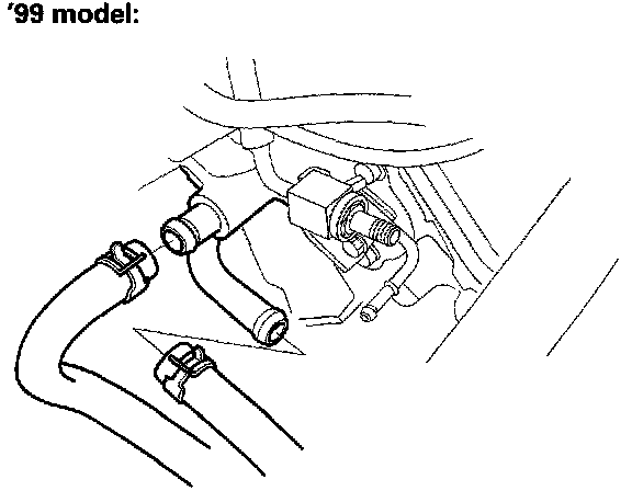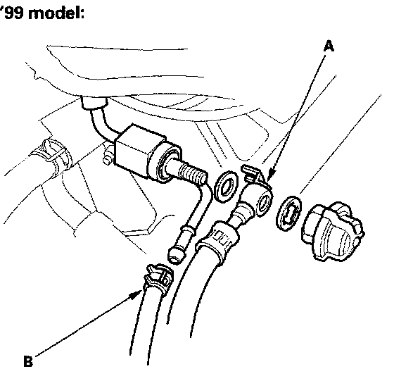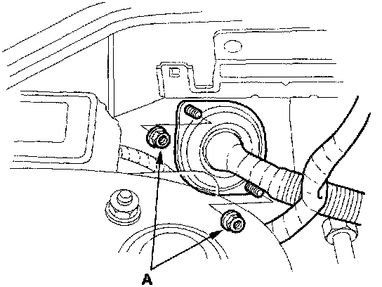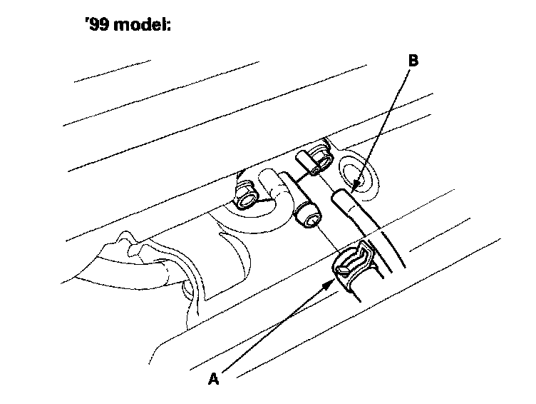 47. Remove the ATF cooler hoses (A), then plug the ATF cooler hoses and lines ('99 model).