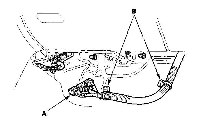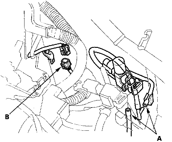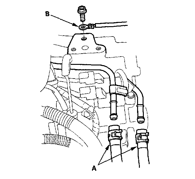 14. Remove the ground cable (A) and harness clamp (B) (J32A2 engine).