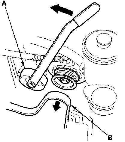 26. Move the auto-tensioner (A) to remove tension from the alternator belt (B), then remove the alternator belt.