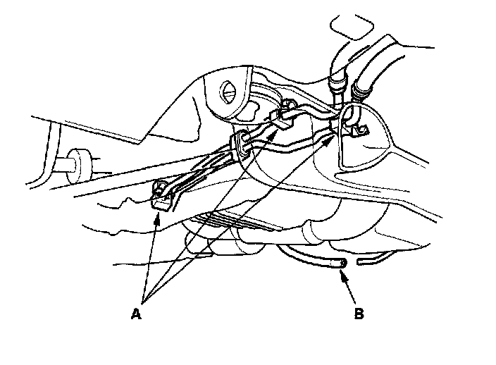 44. Unplug the P/S hose clamps (A), and disconnect the engine mount control vacuum hose (B).