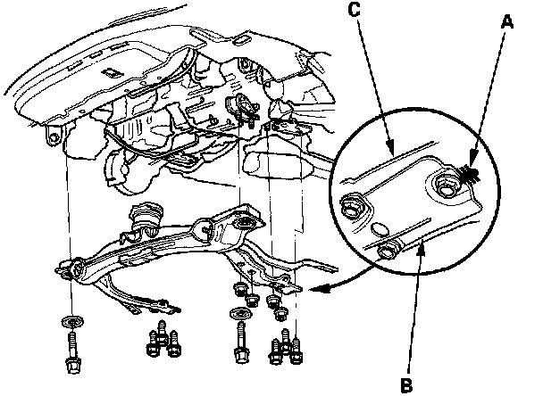 56. Make a mark (A) on the front beam (B) and rear beam (C), then remove the front beam.