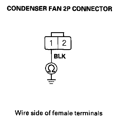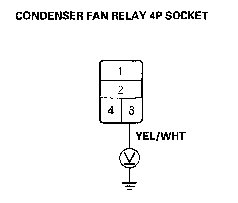 11. Check for continuity between the No. 2 terminal of the condenser fan relay 4P socket and the No. 2 terminal of the condenser fan 2P connector.