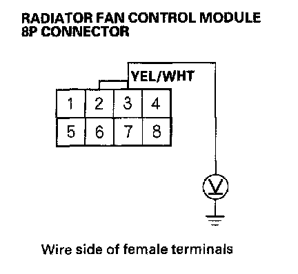 8. Measure the voltage between the No. 3 terminal of the radiator fan control module 8P connector and body ground with the 8P connector connected.